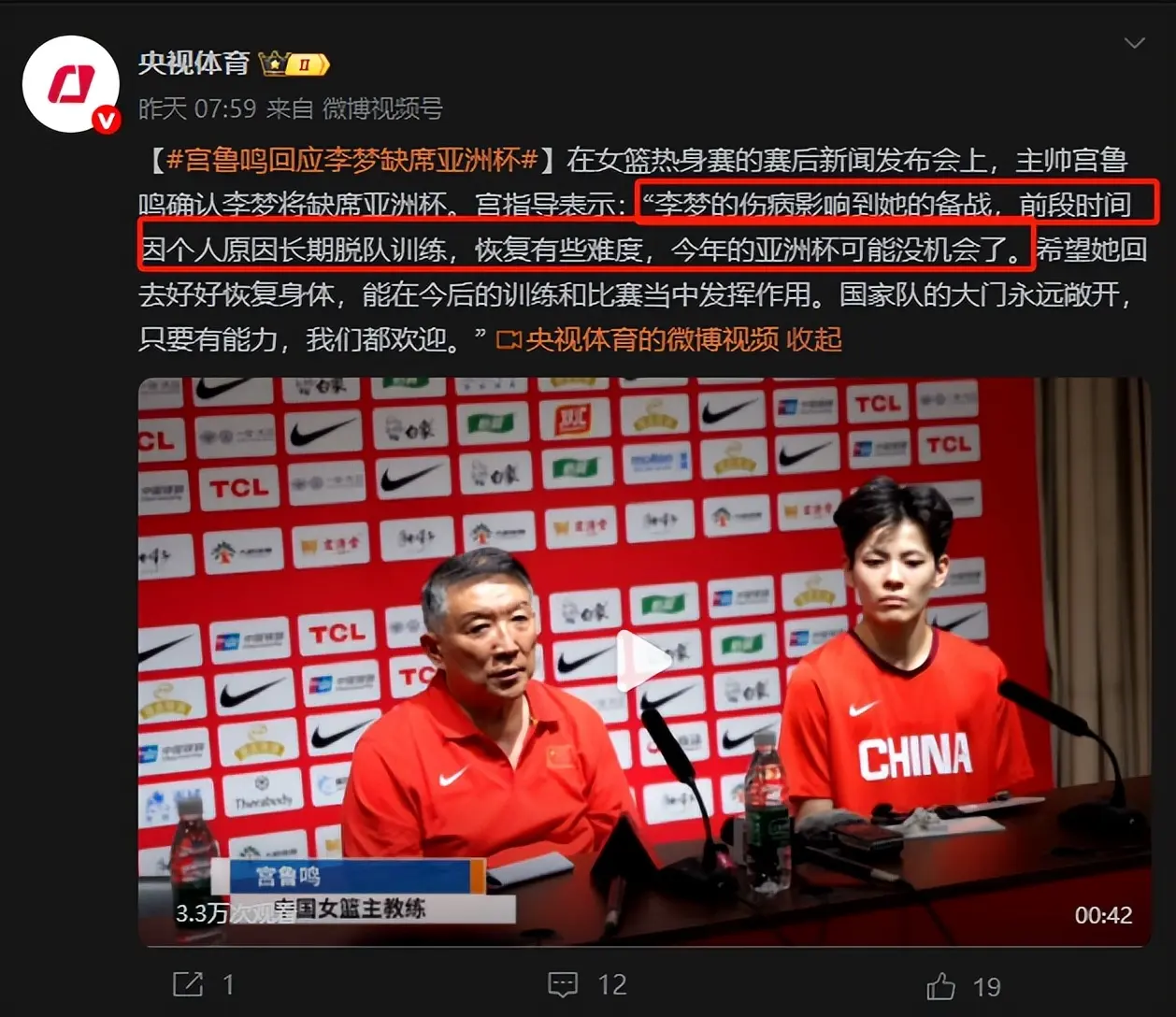 女篮主帅宫鲁鸣宣布李梦无缘亚洲杯,要知道,李梦那可是中国女篮的当家球星。