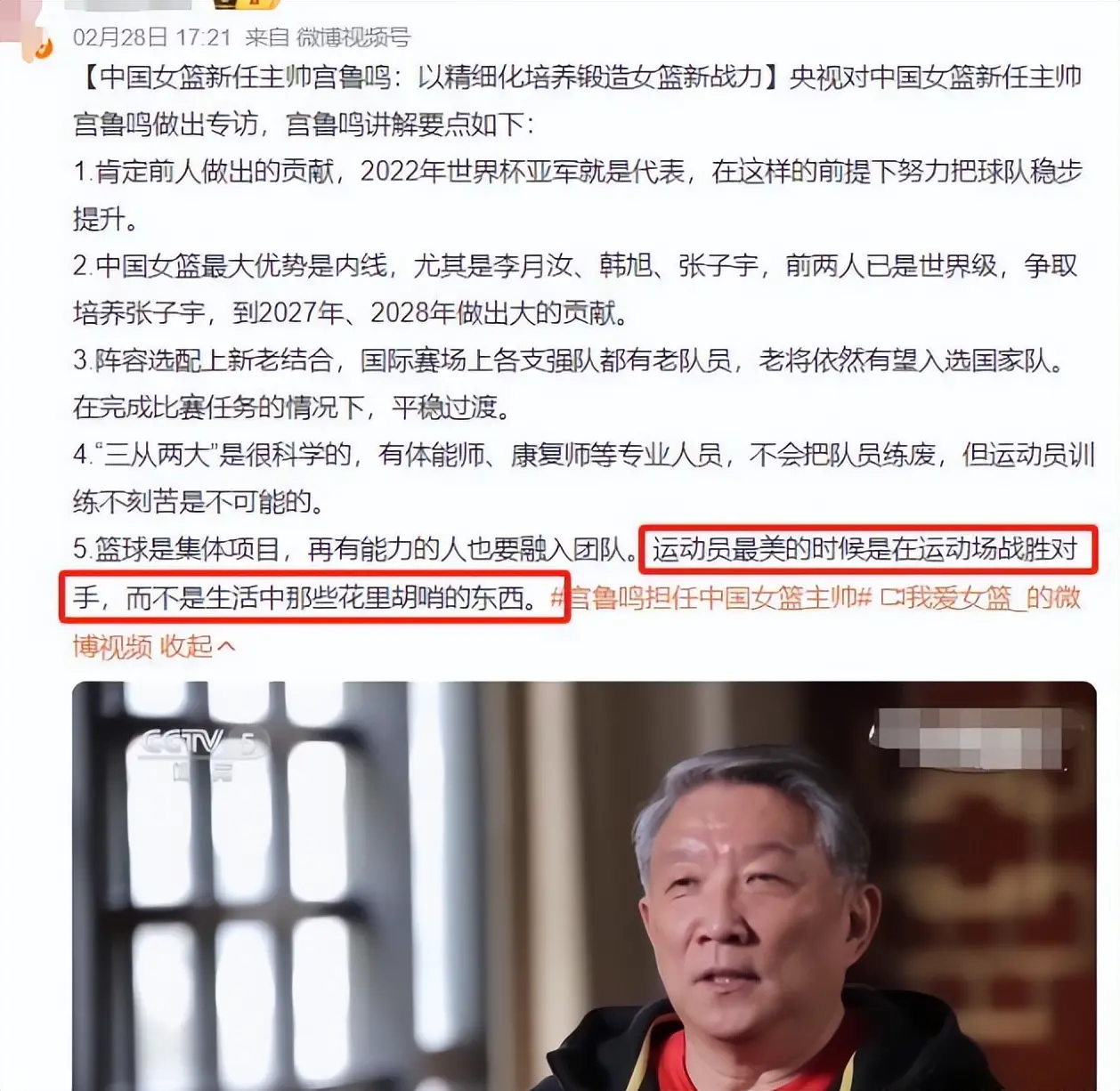 早在今年 3 月,宫鲁鸣刚上任女篮主帅的时候,就在央视节目中,对球队里的一些现象表达了自己的看法。